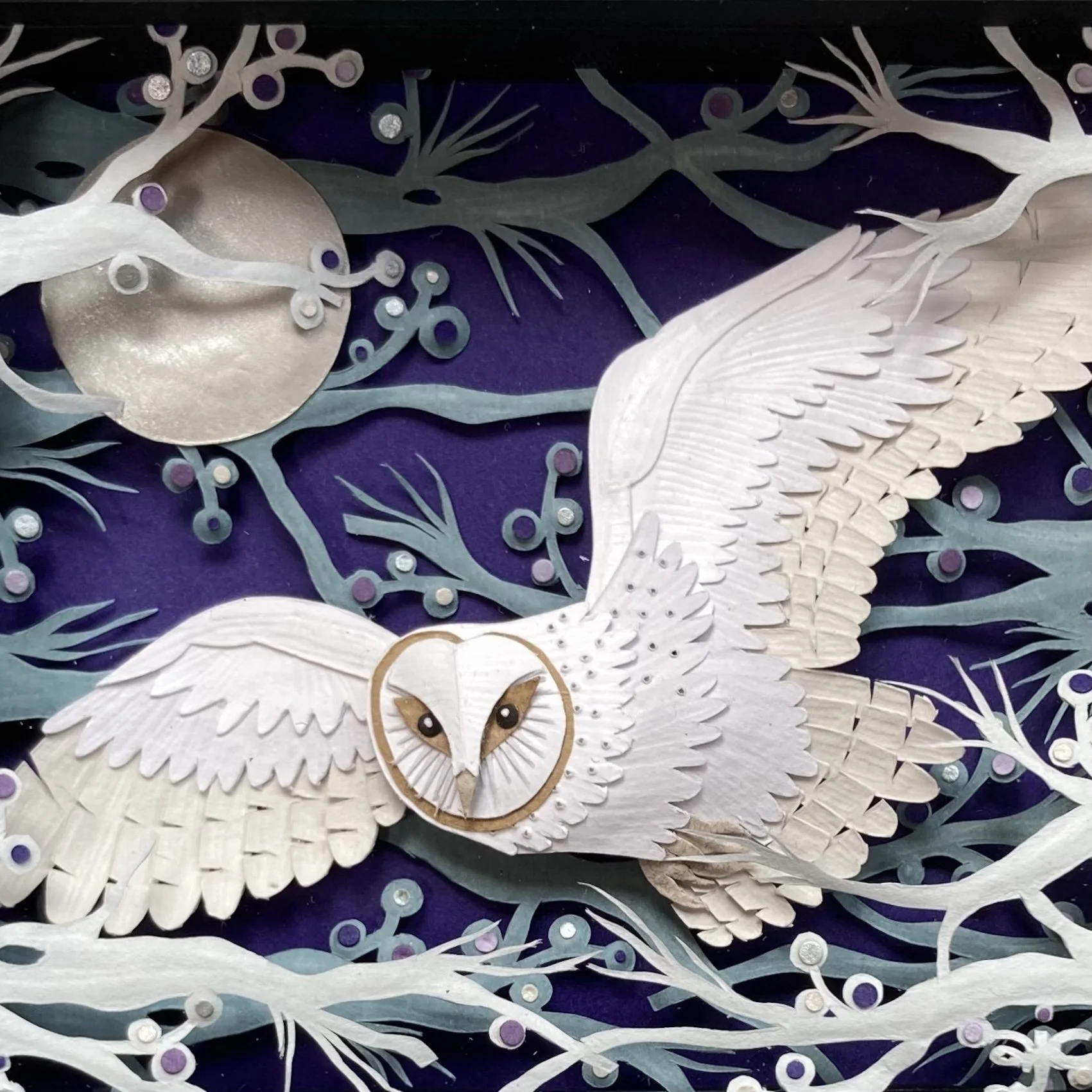 Anna is a self-taught paper cutter with a background in printmaking and picture framing. She specializes in multilayered pieces which are drawn, designed, and hand-cut using a sharp scalpel. Using a range of tonal papers and embossing tools, Anna sculpts the paper to create extra depth. Inspiration is drawn from the natural world and its inhabitants.
